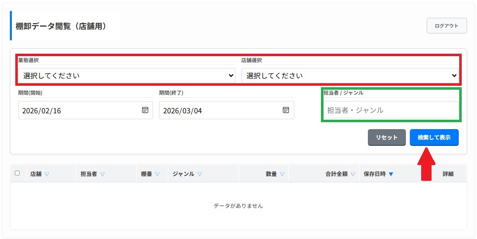 「業態選択」「店舗選択」で自店舗を選び 必要に応じて「担当者/ジャンル」を入力して「検索して表示」を押す