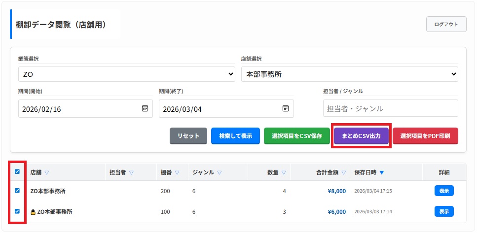 対象となるデータにチェックを入れて「まとめCSV出力」を押す